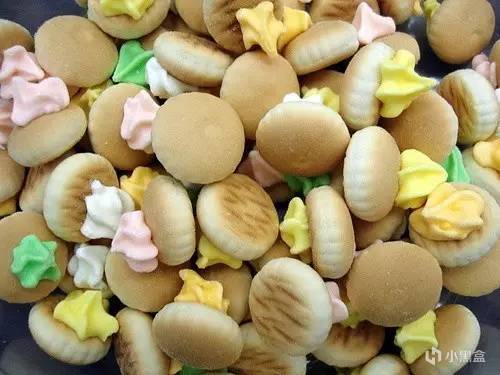 每一顆小餅乾上面都會沾上一朵糖花,好多種顏色的,正確的喫法是先舔一舔,這個不用泡一泡。