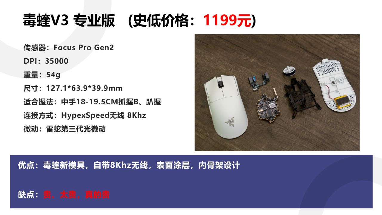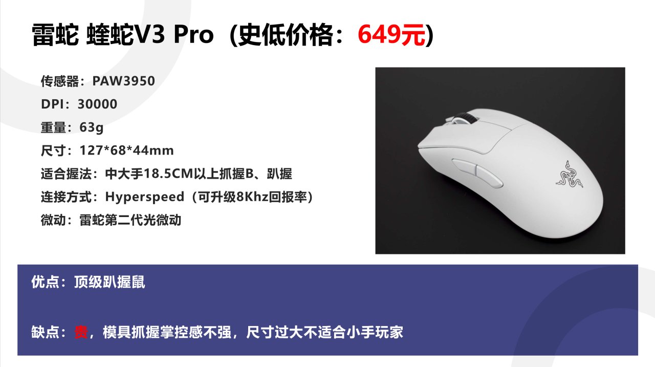 第二款就是蝰蛇V3Pro,目前瓦和CS職業的TOP4。雷蛇模具翻身的一款作品,由於是兩年前的鼠標了,馬上會有蝰蛇V4發佈,所以不急的話可以再等等。着急的話,最近疊甲國補也有一個不錯的好價格。