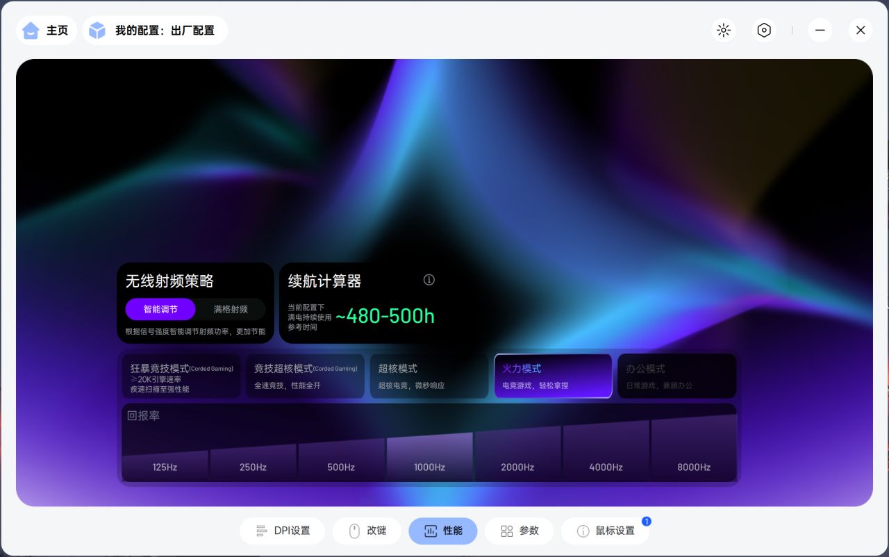 即使在8Khz回報率模式下續航時間居然也能達到非常驚人的100小時,比別家翻倍還要更多。而在1Khz模式下,更是能達到500小時的續航時間。