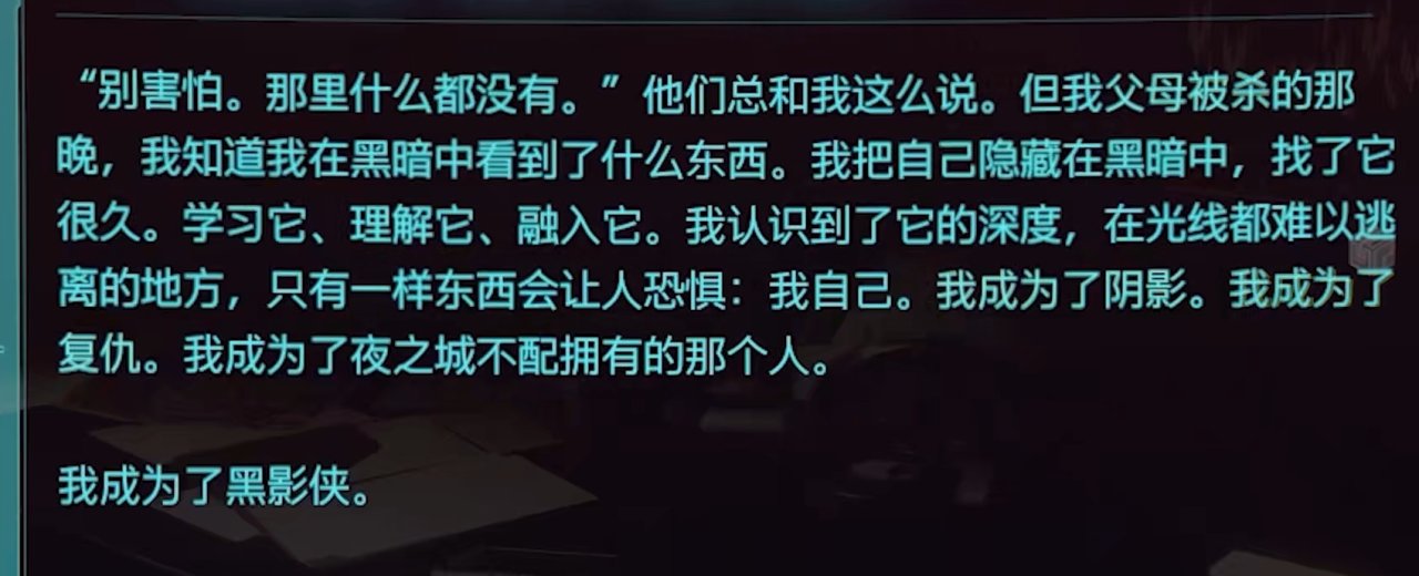 在遊戲中能找到一段黑影俠的自述,但從其中“父母被殺”,“成爲陰影”等描述來看,指的就是蝙蝠俠