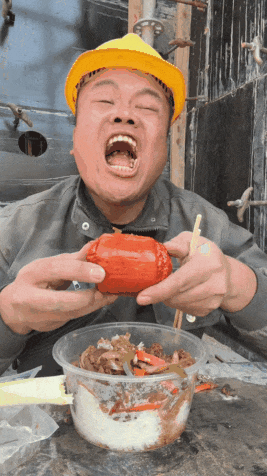 誰懂,蓋澆飯就是要一隻手將塑料碗輕輕抬起,另一隻手拿筷子,再把頭低至碗邊,筷子扒拉飯菜往嘴裏送。