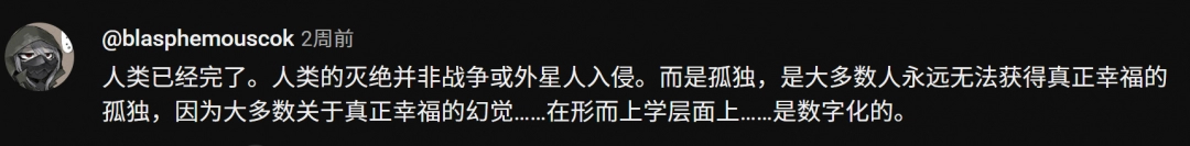 不是疫情,不是第三次世界大戰,那些人類可以應對。但虛構的愛情呢?感情纔是我們最大的弱點。而這也是爲什麼全世界有這麼多人沉迷於情色,爲什麼有這麼多關於愛和心碎的音樂、電影、動漫和其他不同類型的文學作品?爲什麼我們要在虛擬世界(Galgame、VR、ASMR等等)尋找慰藉?