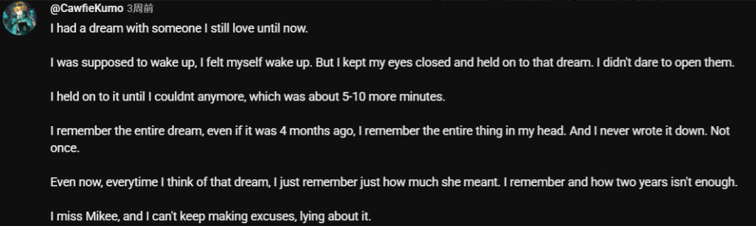 “我本該醒來,感覺自己醒了。但我閉上眼睛,想要緊緊地抓住那個夢。我不敢睜開眼睛,一直堅持大概又過了5到十分鐘直到再也睜不開。我從未寫下來,一次也沒有,但我腦子裏全都記得,記得那個夢有多重要,我想念她,我再也找不到藉口欺騙自己。”