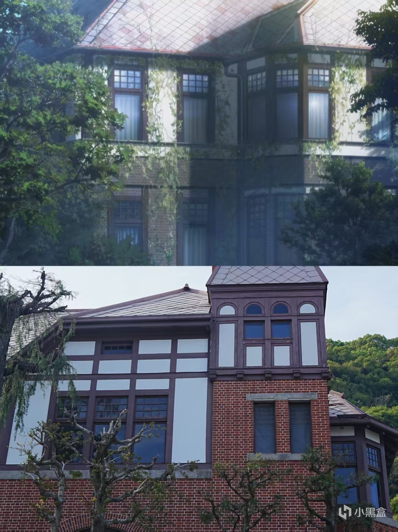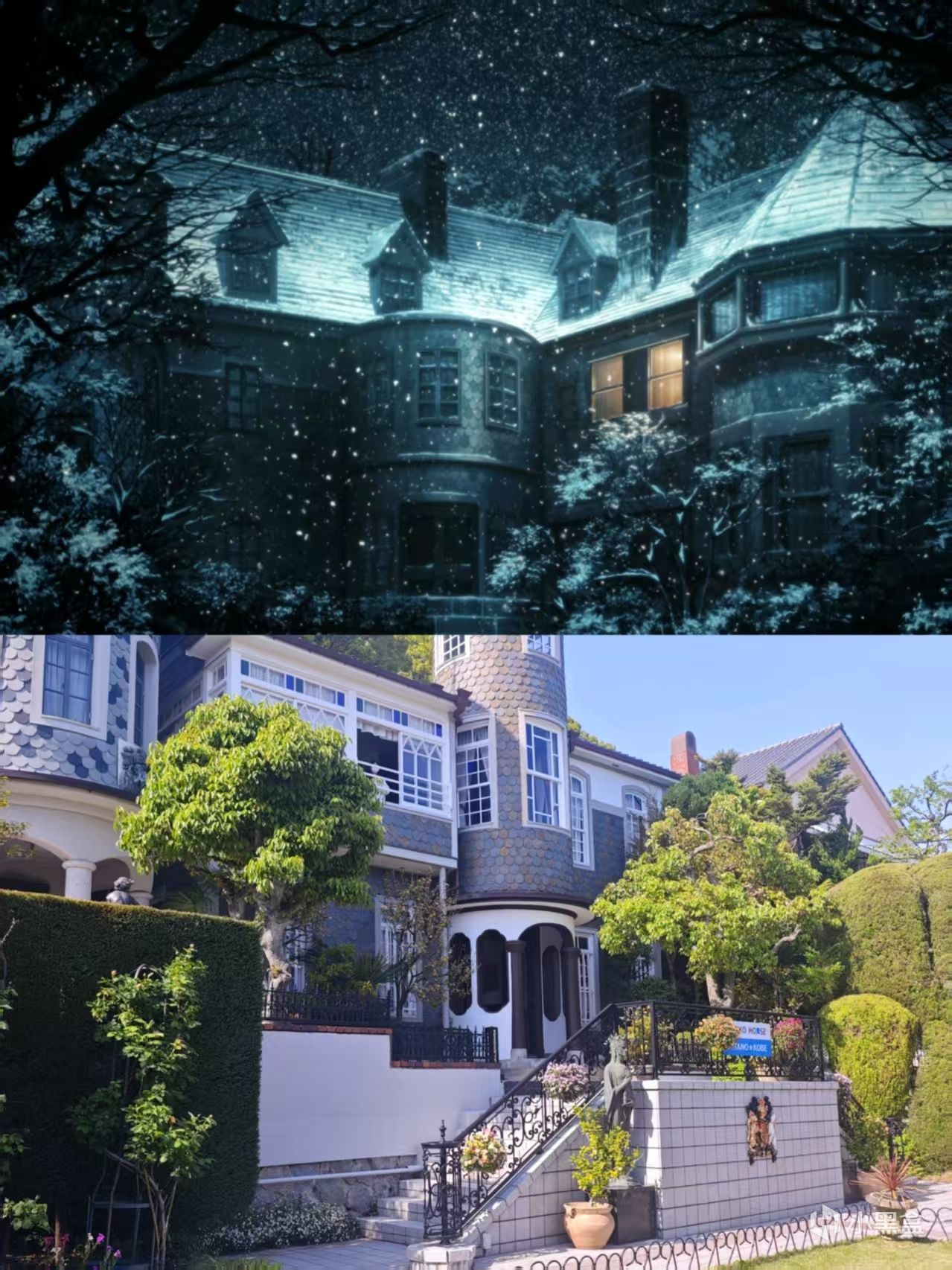 到上面之后有卖通票、不过因为我只看鱼鳞之家就没有买这个、挨着看到了风见鸡馆和鱼鳞之家,两个建筑分别是凛和樱的家的外观和内饰的取景处(不过是进行了混合,一个的外形搭另一个的内饰),过去的时候发现凛家的外形原型:风见鸡馆在重新装修,估计要下半年才会开放(即下图、第二张是和动画的对比图)