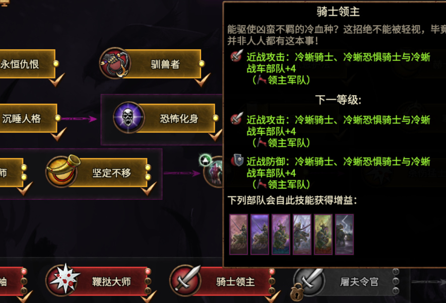 关于「杀戮造诣」的增益机制,你可以先用步兵射手去杀敌,叠到300多人头开启。先前打的骑兵增益MOD+这个被动冲锋25%,让骑兵部队轻轻松松叠出成倍冲锋伤害。激战正酣时给敌人来一波背冲,就是推土机犁地(巴托尼亚狂喜)