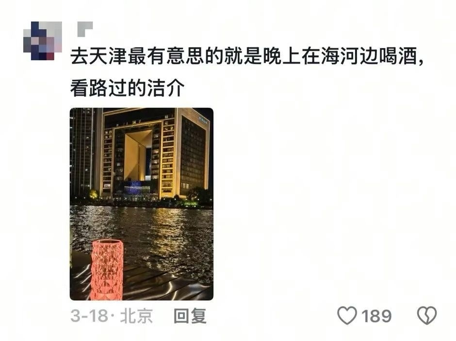 “别的城市的夜景,是月光湖面和微风,远处灯火辉煌的摩天大楼;天津海河边的夜景,则是快板噼里啪啦,伴着臭豆腐飘香,海河里面的大爷活蹦乱跳,这才是更适合中国宝宝体质的浪漫。”
