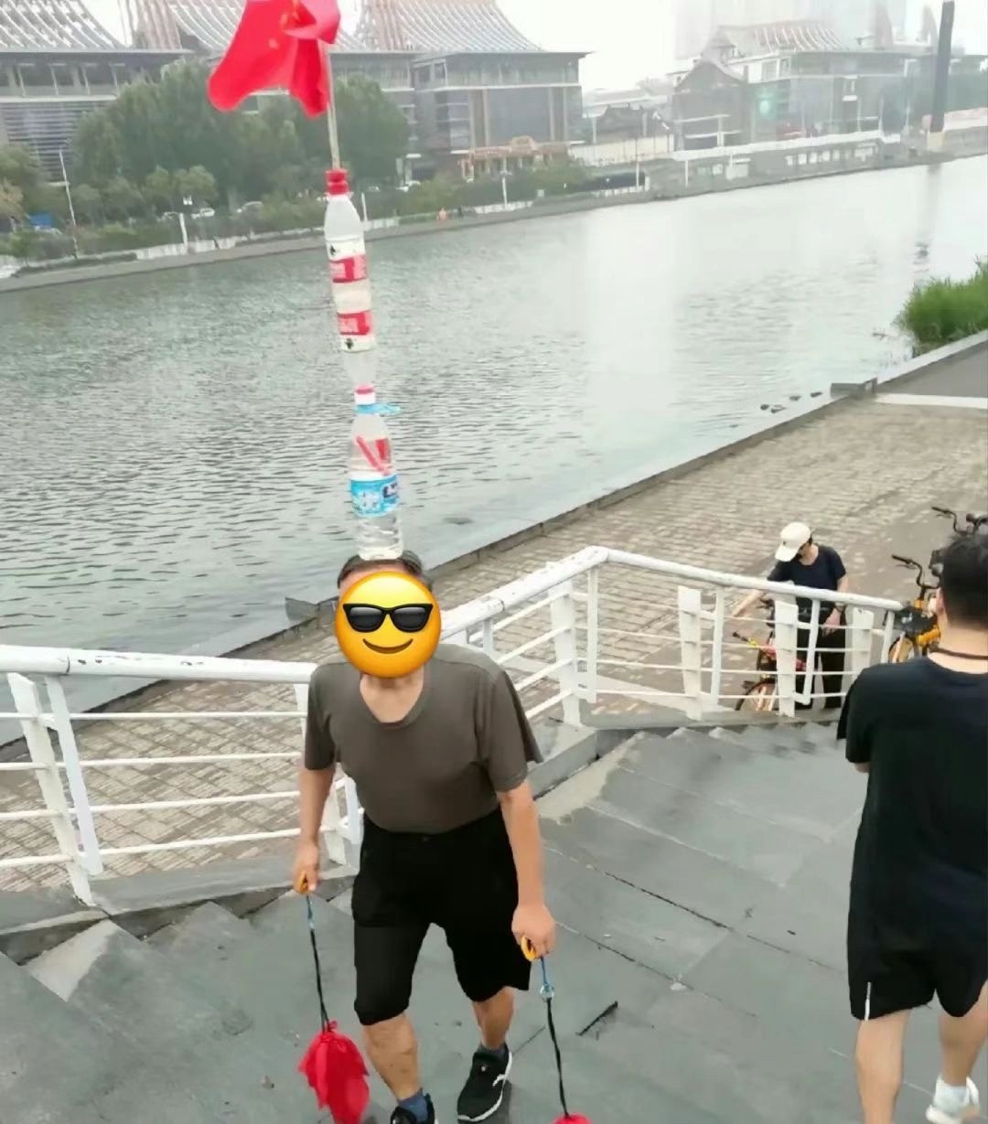 走路时往脑袋上顶东西也是不稀奇的,顶矿泉水瓶、顶板凳,下雨时直接套个塑料袋,当头部雨衣;