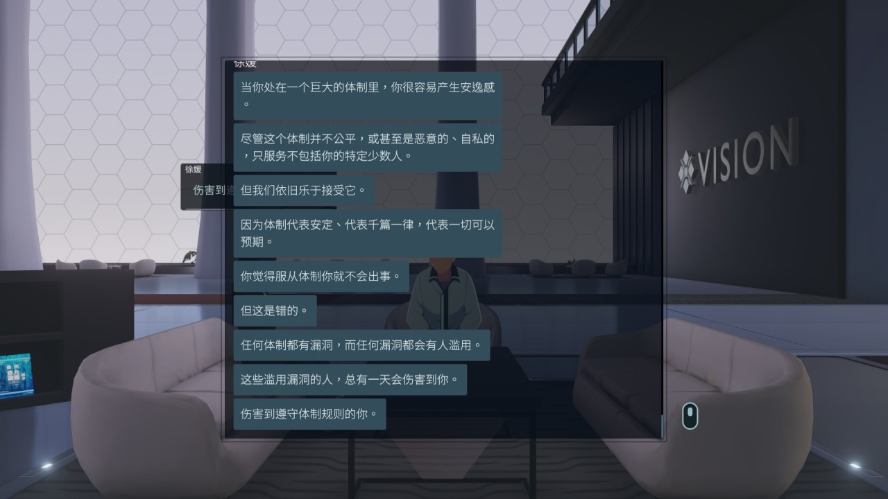 “玩家意志”在此时与“角色本性”冲突、交流,多种人、事交织纠缠。万象科技底下的阴谋也牵动而出,无法摆脱泥沼的身边人,深探而下融解其中的“我”。