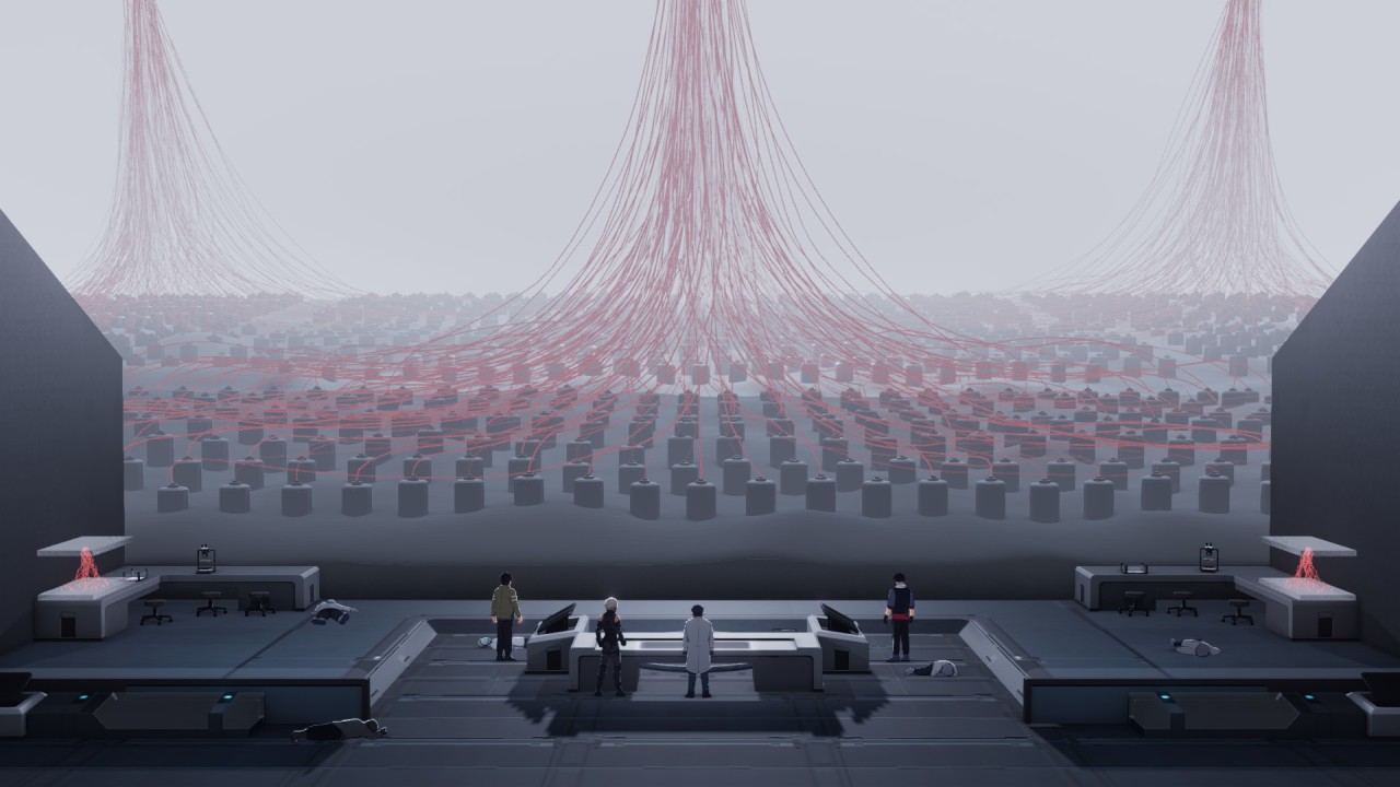 “高科技低生活”的赛博概念在这一次被拆解到一个更贴实更“低维”的命题。“算劳”,将人以器械包裹悬滞于天花板、压榨其脑力为ai供能的产业。当岗位大量被ai取代,算力成为生产重需。不管人类是否甘愿成为算力生物电池,“算劳”也不是每个人都有资格能成为的。