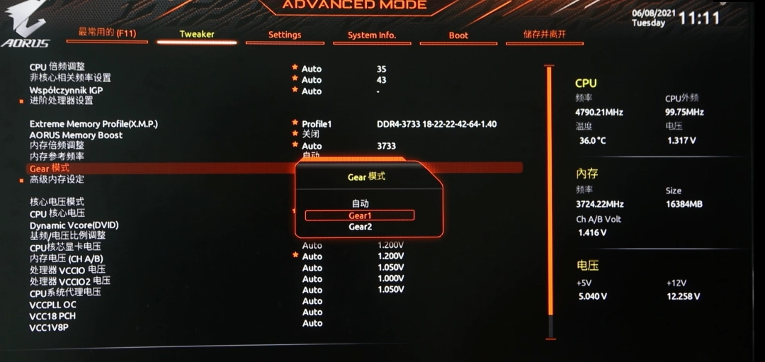 而進入到進入主板 BIOS 設置,我們能夠看到這裏的 Gear 模式。而 Gear2 代表了分頻的倍數-- 2 倍就是 1 : 2 了嘛!