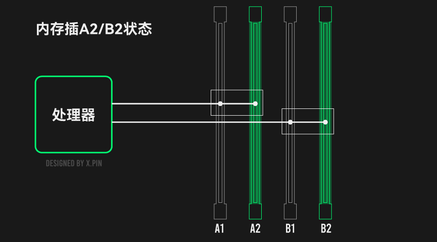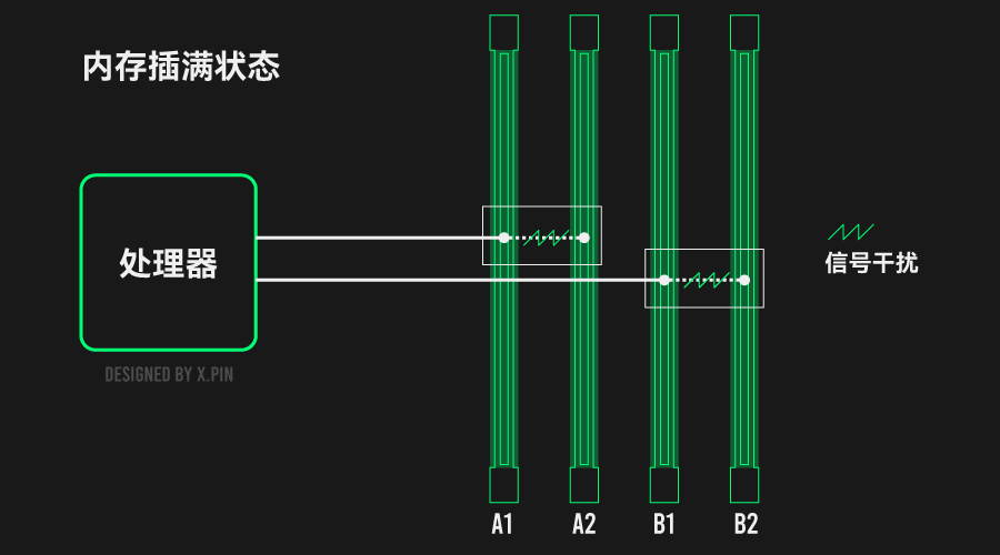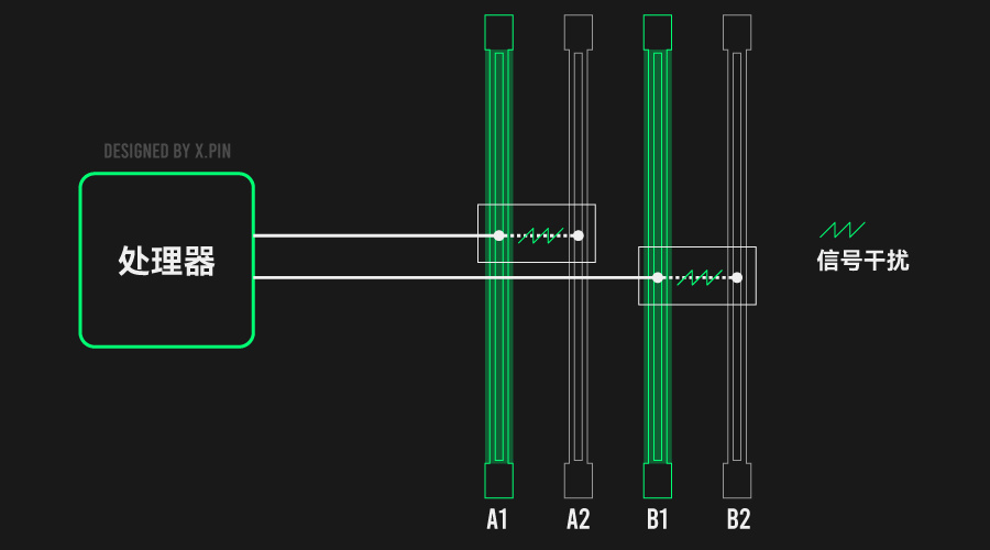 而內存插在 A2 / B2 時,內存到控制器之間是一條完整的線路,此時沒有殘線干擾。這也是廠商推薦內存優先插在 2 / 4 內存槽的原因。