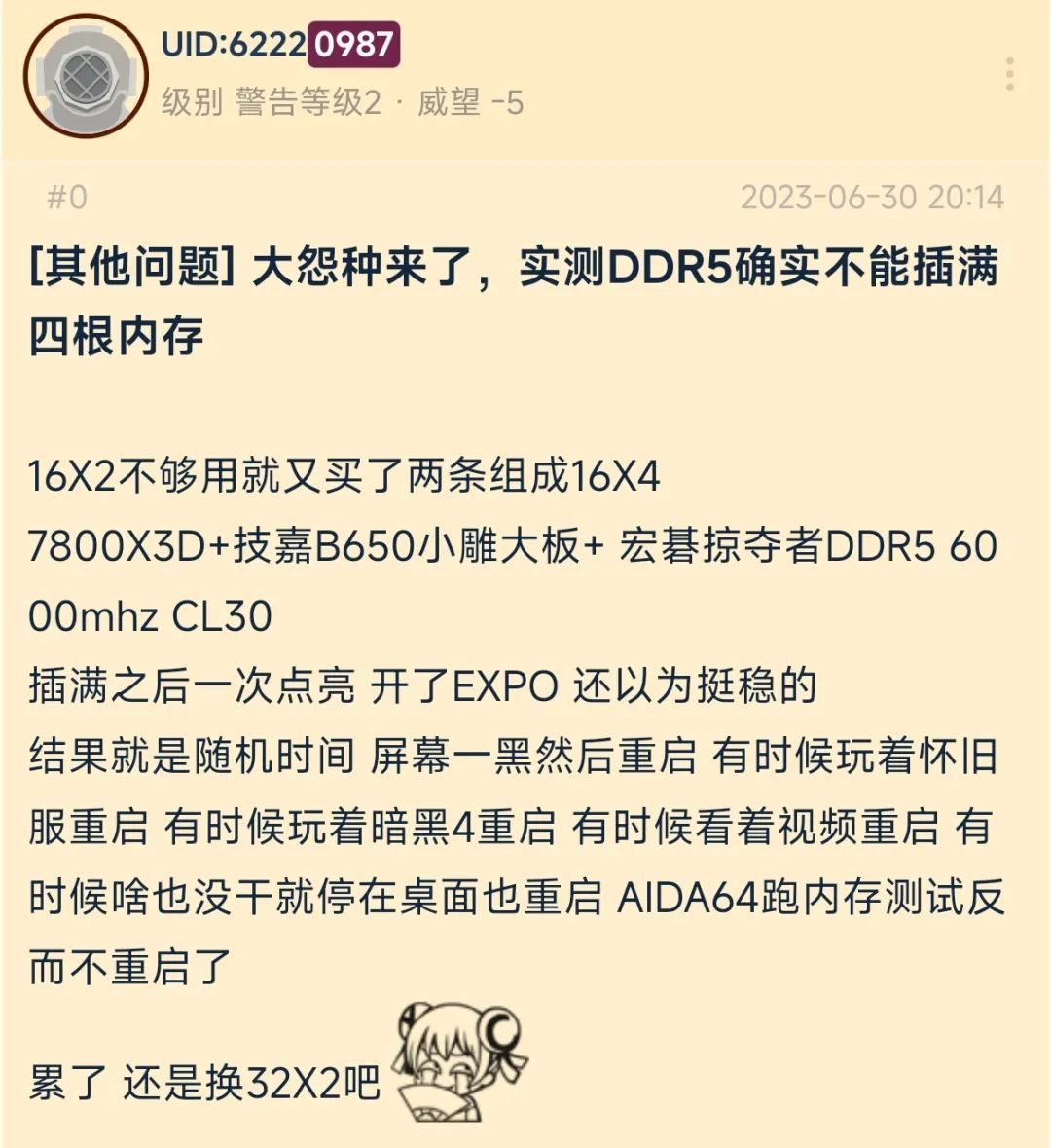 可你網上搜索” 4 根 DDR5 “相關內容的時候,很多網友都在吐槽插滿 4 根 DDR5 內存後的各種問題。
