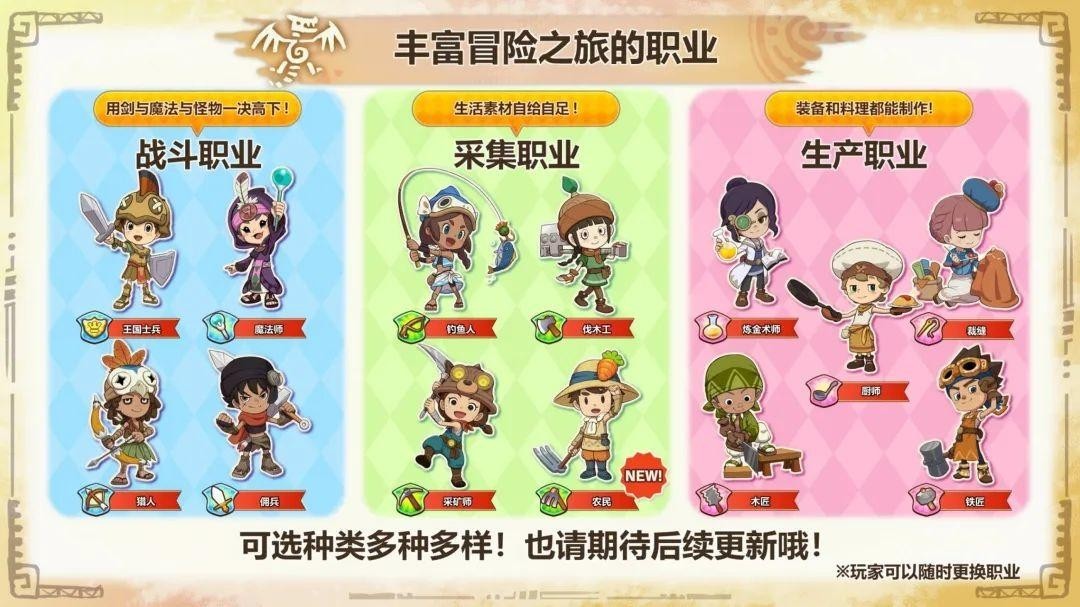 接下来让我介绍一下本作的一些特色设定,首先就是职业体系。游戏中总共有14种可选职业,而这些职业又分为战斗、制作、采集三大类型。魔法师、猎人等战斗型职业,顾名思义会有较强的战斗力,采矿师、伐木工这种采集型职业,有利于收集相对应的素材类型,铁匠木匠厨师等制作型职业,则能够制作各种道具,产出物品里包括对于战斗至关重要的装备和料理。你可以在同一周目兼修所有职业,并且在需要的时候轻松进行切换,不同职业之间形成一个相互辅助的良性循环,让你愿意花时间去尝试各种路线的发展可能性。