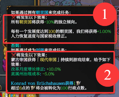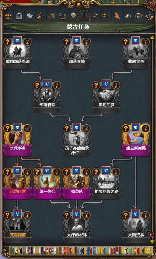 条顿成立蒙古帝国同样变成蒙古帝国tag,此时刷新任务树便可获得蒙古任务树