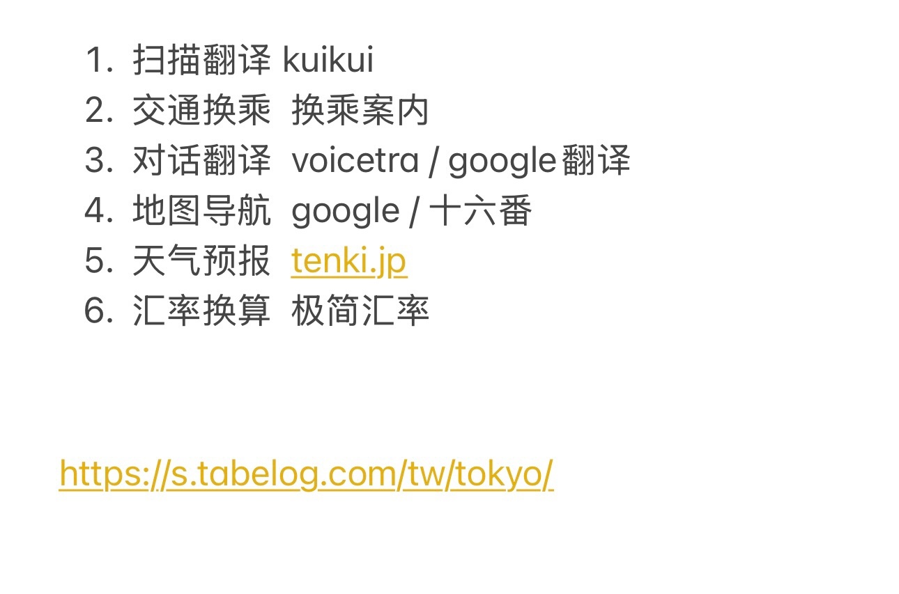上面图里是我做攻略选择的一些app。第一个kuikui用起来还好,但是有次数限制,鸡肋。地图导航和坐车用谷歌地图就够用, 一开始肯定不习惯,因为用着没有高德得劲。对话翻译就选voicetra。其他方面的app看个人需要。最后的网址是一个美食推荐。
