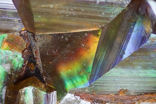 当光线照射这些石榴石时,彩虹石榴石表面复杂的结晶层对光束造成了干涉和衍射,而大家都知道我们日常中的光是由、橙、黄、绿、蓝、靛、紫组成的,它们对应着不同的波长。光束中那些不同颜色的波长因各自的干涉条件被分离开来,在不同角度下不同光的波长得到了一定的增强或者衰减,最后就展现出了彩虹般的色彩。