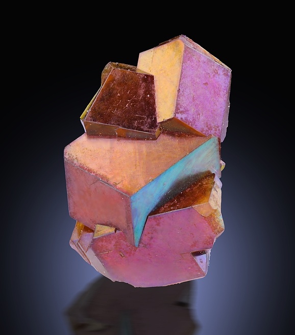 这种颜色产生的原因是,在彩虹石榴石内部,存在许多的同心层状结构。在晶体生长的过程中,Fe³⁺首先参与生成了钙铁榴石,这时Fe³⁺含量减少,Al³⁺富集,又在钙铁榴石上层形成了含铝量较高的钙铝榴石。 这两种元素交替沉积,形成了一层又一层的复合结晶层,而且每层复合层的厚度通常小于一微米。