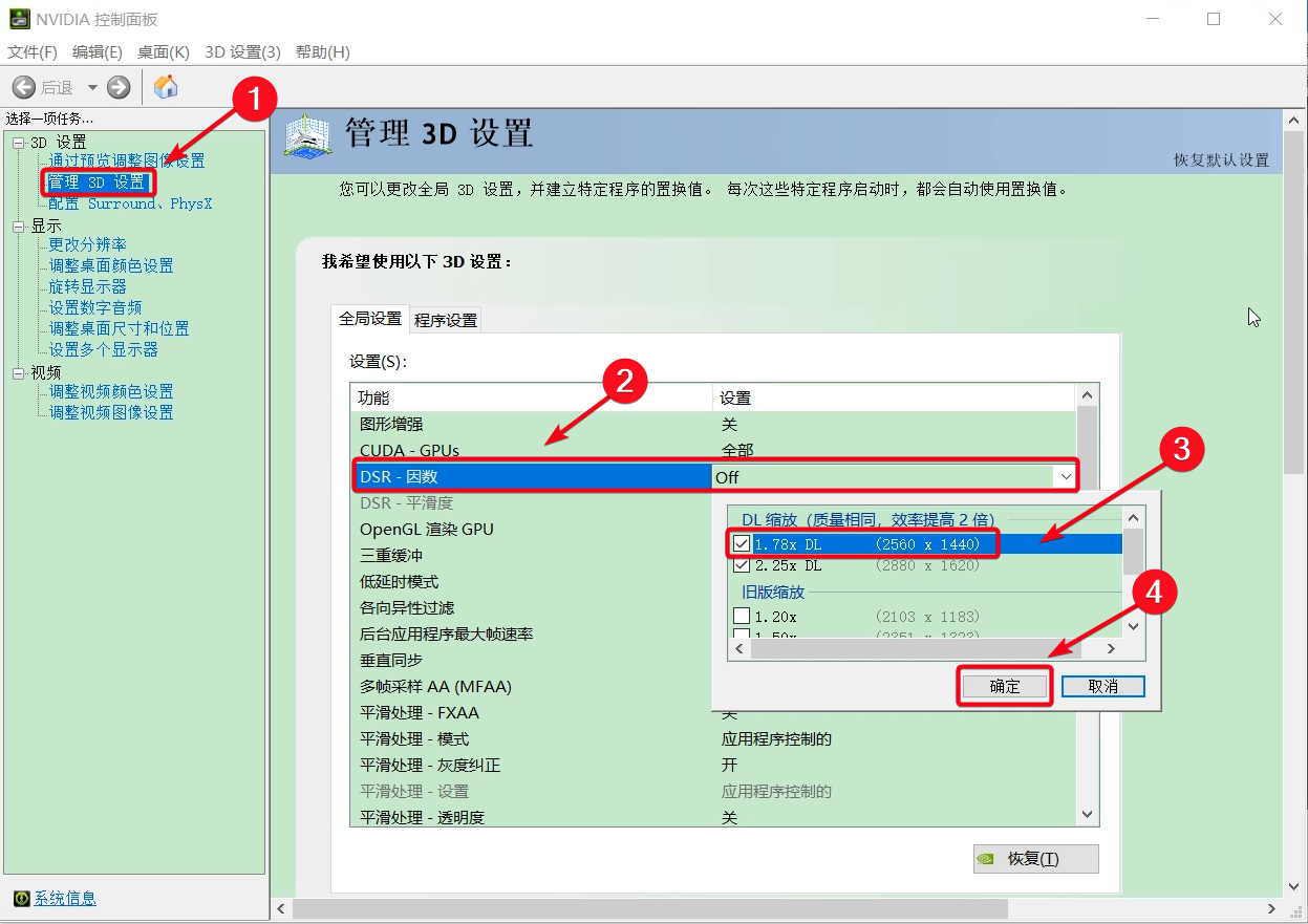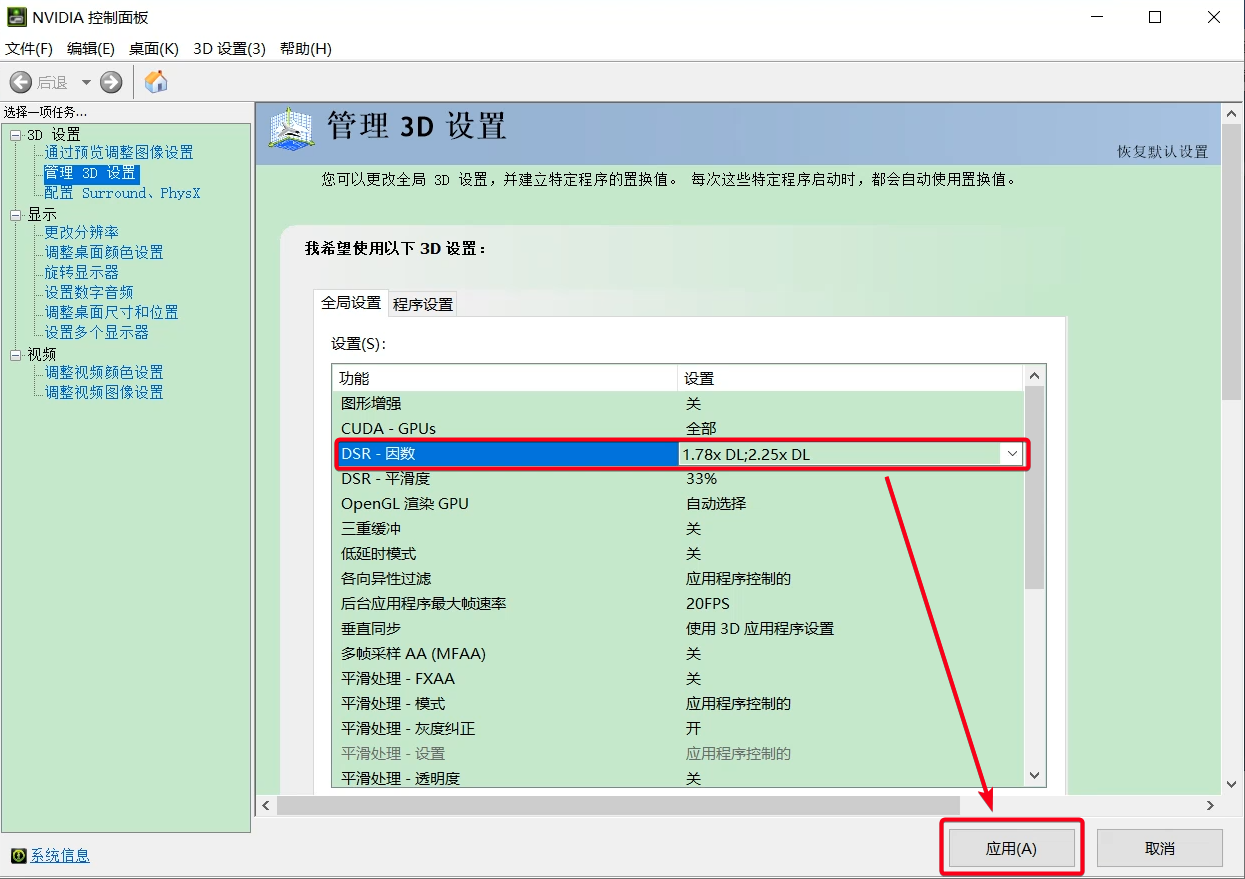 在“管理3D设置”中找到“DSR-因数”,因为我这里使用的是20系的显卡,可以选择DLDSR缩放。