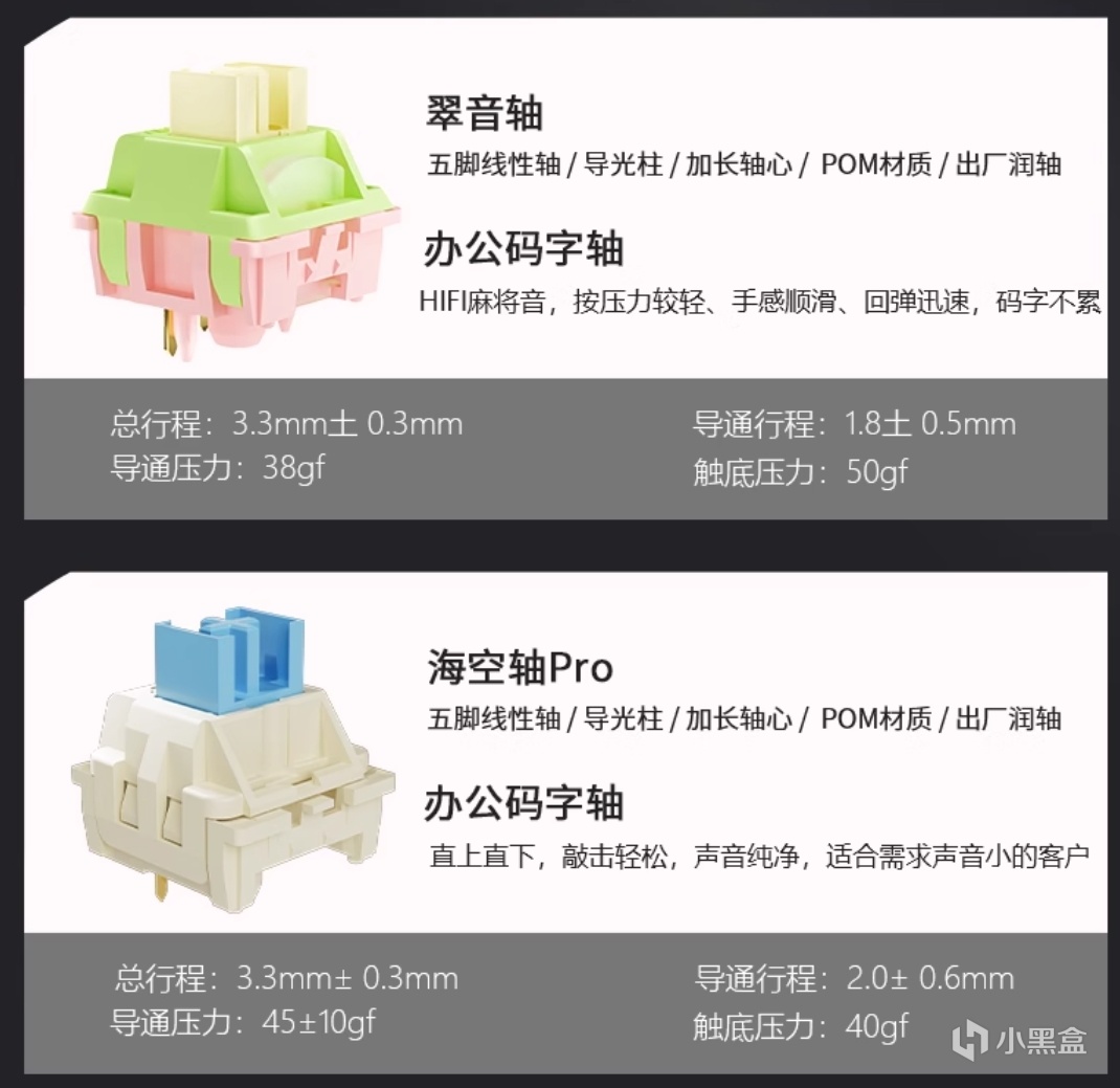 軸體:三模:海空pro軸,翠音軸;有線:銀軸、銀灰軸、青軸、紅軸、金軸