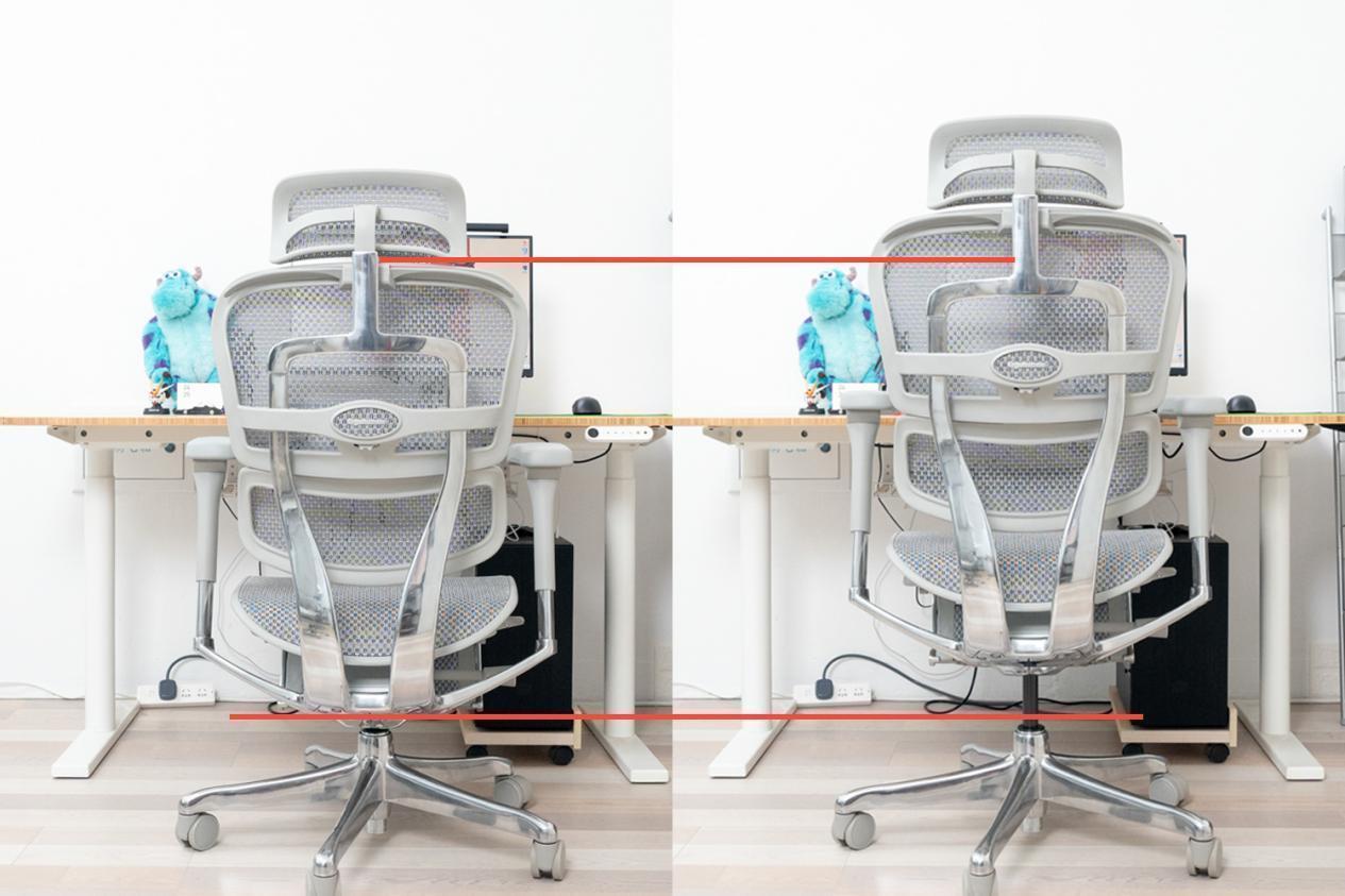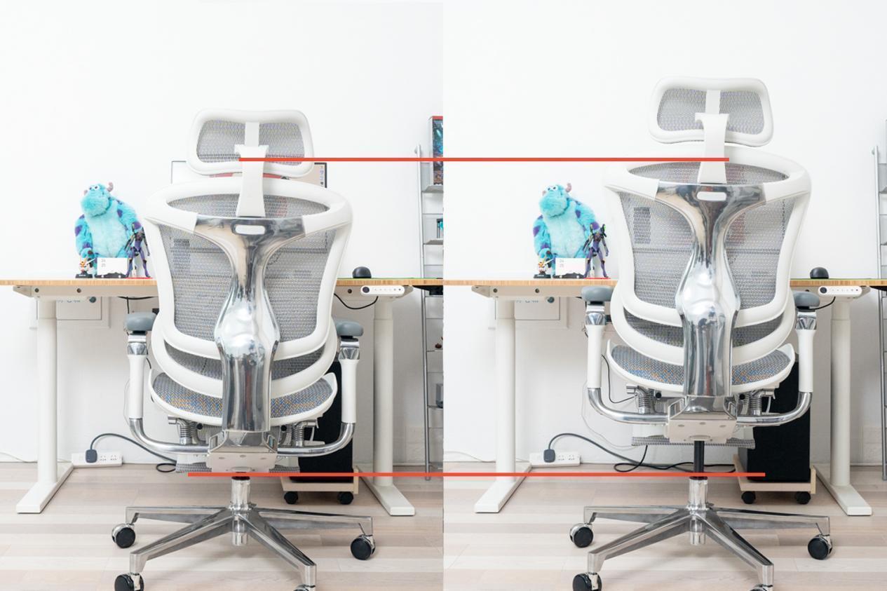 保友 金豪E2的椅背支持上下6.5cm的高度调整,调节范围相当可观。我的桌高76.5cm,大家可以做一个参考。