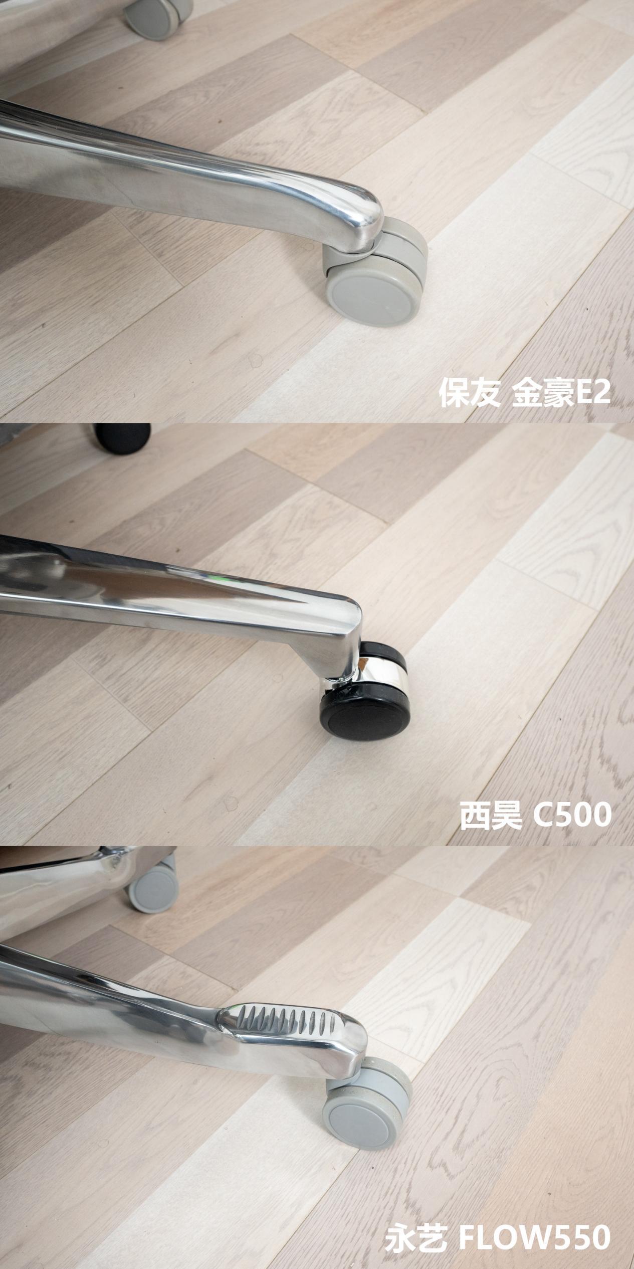 三款人体工学椅都是全铝合金五星椅脚+PU静音轮的配置,承重表现和拖行顺畅度表现最好的是保友 金豪E2,永艺FLOW550在移动时会略显吃力。