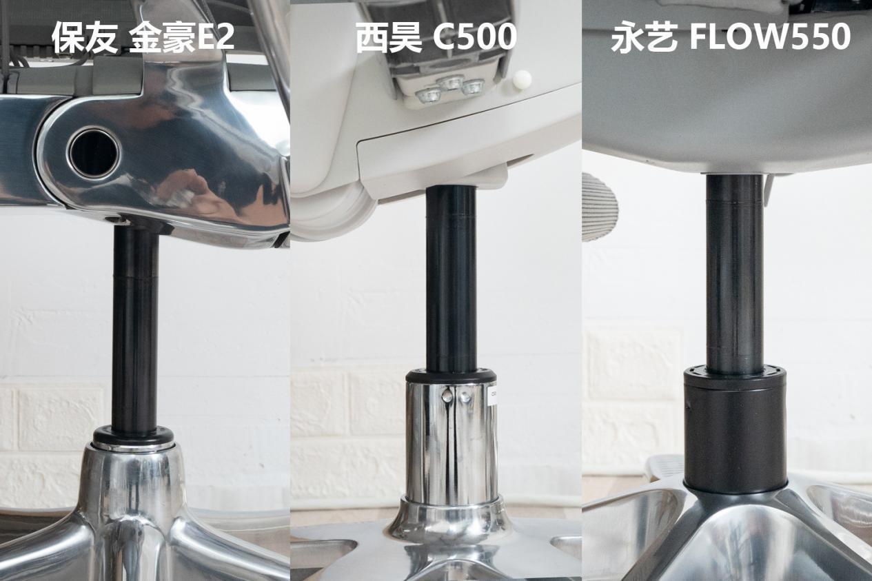 三款人体工学椅都采用进口四级气棒。保友 金豪E2采用韩国KGS四级气棒,通过BIFMA认证;西昊C500的气棒通过了SGS和BIFMA认证;永艺 FLOW550的气棒则是通过了BIFMA和TUV认证。