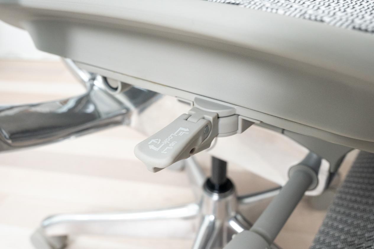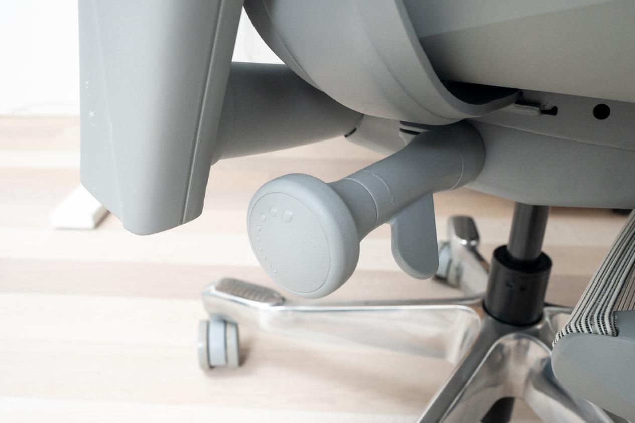 除了基础的后仰,保友 金豪E2还支持座背联动前倾,将底盘左手边的拨杆解锁后就可以让整把椅子进行7°的前倾,能够大大减轻伏案时肩颈、腰腹和腿部的压力。