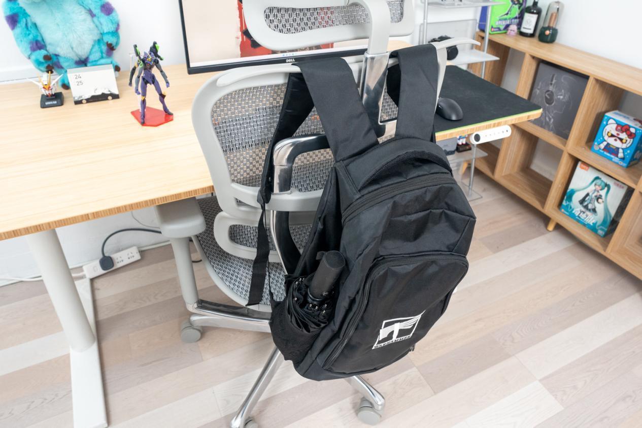 在保友 金豪E2的椅背上还设置有一个可以自由伸缩的衣架,只需要用手一拉两侧就能联动展开,不用时只需要按压衣架底部的机关,两侧的衣架就会自动收回,收纳状态下的衣架与椅背的一体性很强,难以让人察觉到存在。