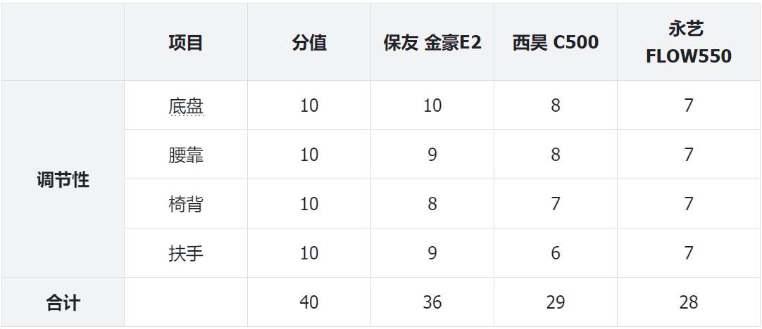 这三款人体工学椅在调节性的表现上可谓是各具特点。总体来说三款工学椅都能满足大部分体型身材用户的使用需要。我个人最满意的是保友 金豪E2,这把工学椅不仅调节范围很大,调节的有效性和调节时的体验表现也都非常出色,整把椅子前倾和扶手的前端上翘都是非常特色且实用的设计。西昊C500在调整的过程中各个环节都比较顺畅,但这种顺畅却让使用体验打了折扣,像是扶手和椅背的调节在档位的设置上有些模糊,经常容易掌握不好位置以及误触。永艺FLOW550的调节范围是三者里面最小的,并且在调节方式上与其余二者不同,总体的表现堪堪够用。