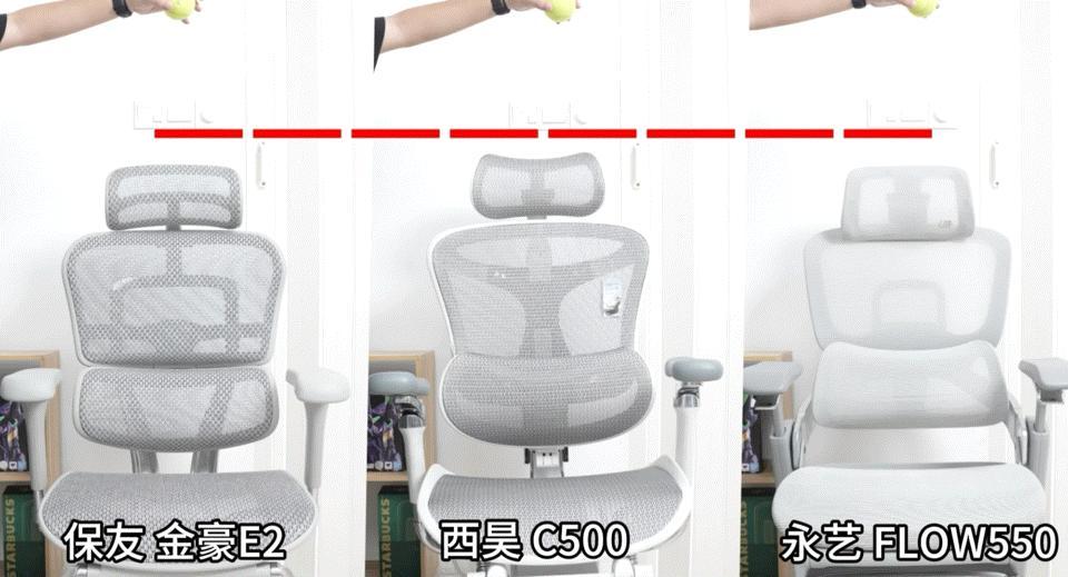 我们用网球分别在三把人体工学椅的上方进行自由落体运动,可以非常明显地看出,三把人体工学椅中,保友 金豪E2的回弹明显要好于其他两把人体工学椅,西昊 C500其次,永艺 FLOW550表现最差。