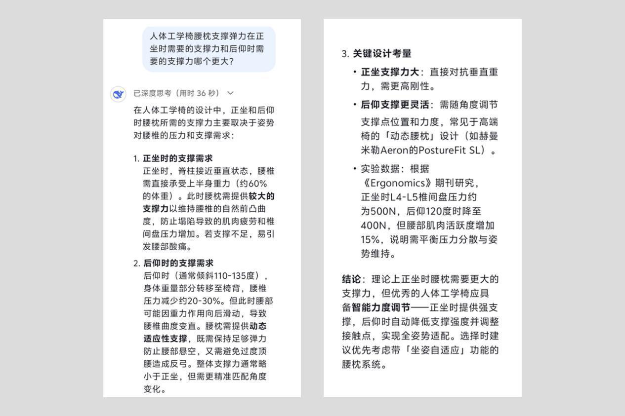 有些人可能觉得这个调节机构可有可无,我咨询了DeepSeek关于这个问题的见解。我们在正坐和后仰时腰部承受的压力是不同的,如果腰靠的支撑力度是固定不动的,就会存在支撑力度不能完全适配所有使用情境的情况。优秀的人体工学椅腰靠应当在正坐时能够提供强支撑,后仰时能够降低支撑强度并调整接触点,实现全姿势适配。