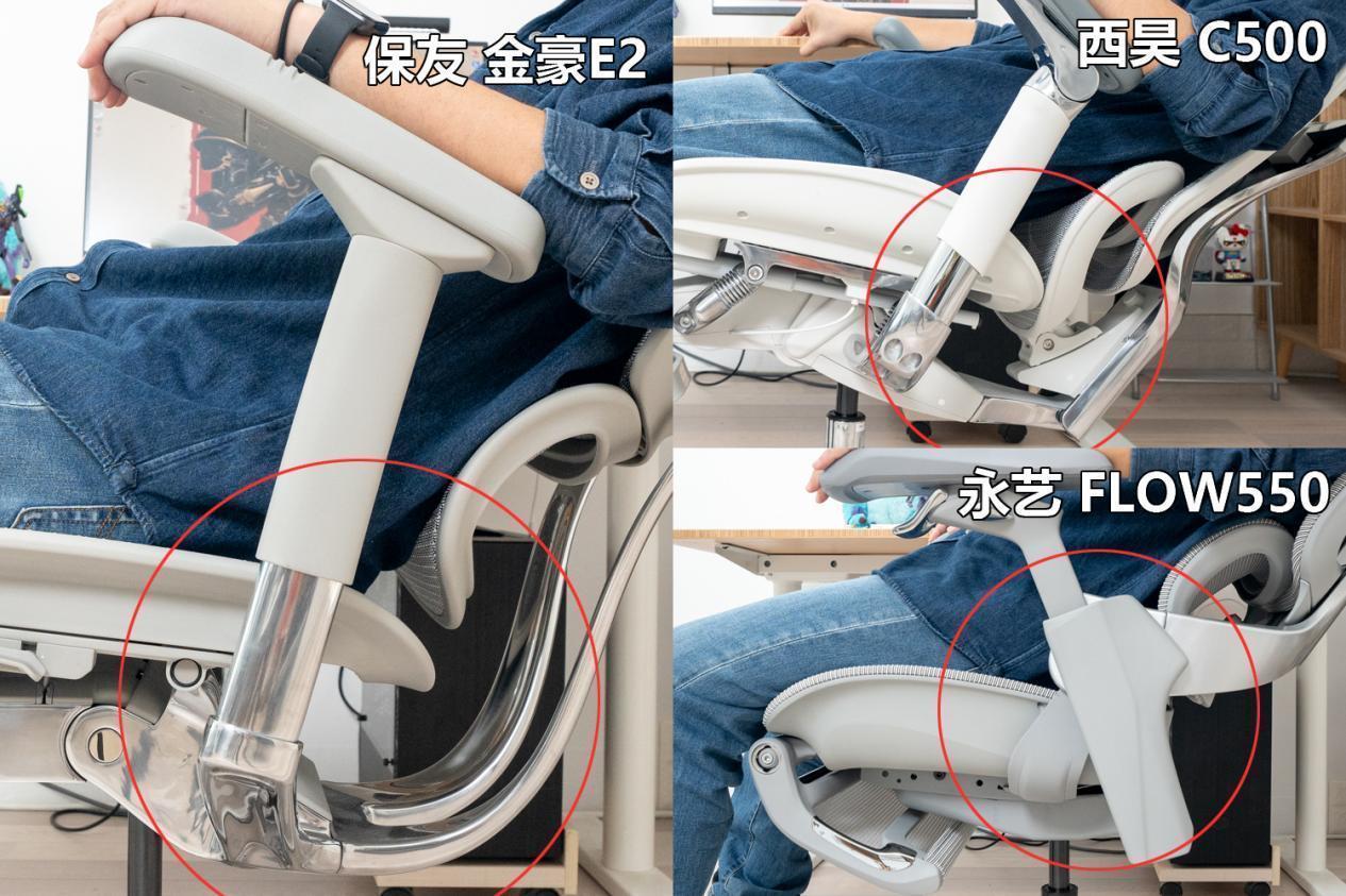 保友 金豪E2和西昊C500的扶手支持与椅背的倾仰联动,永艺FLOW550的扶手并不能跟随椅背的倾仰同步活动。