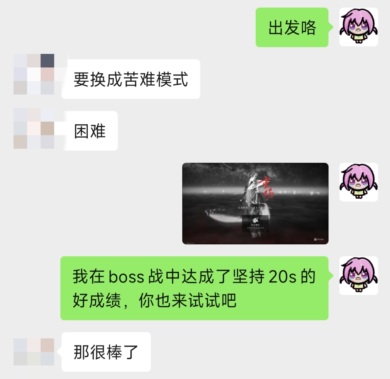 游戏中有简单、困难、鬼神愁,而我朋友想要的头像需要满足的条件是通关困难难度,可我却误认为要达成鬼神愁无伤通关。为了拿到头像,我从上午11点开始,打到晚上11点寝室断电,中途还花了三十分钟给鼠标充电。
