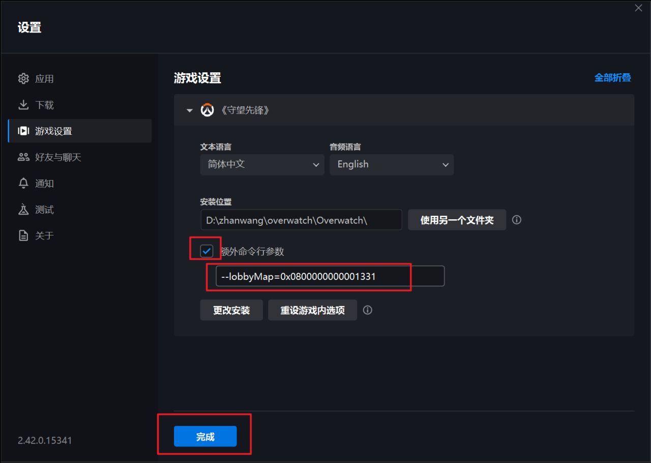 2.勾選“額外命令行參數”,將代碼複製粘貼進去,再點擊完成,進入遊戲