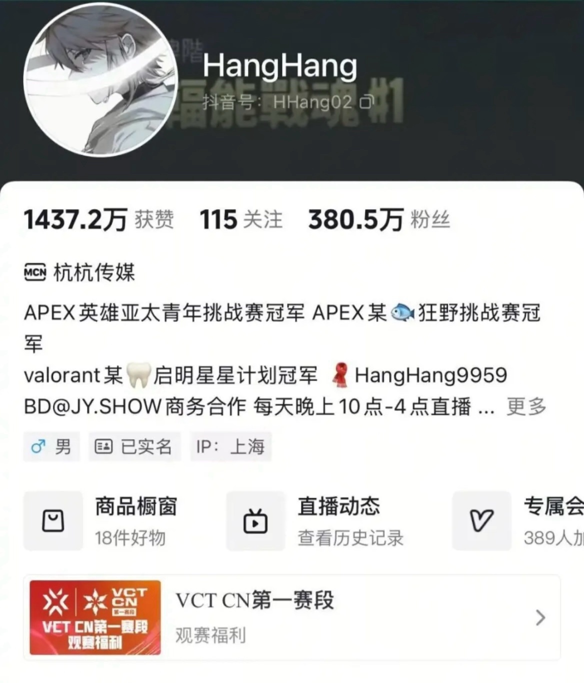 - 無畏契約賽事解說:當無畏契約冠軍巡迴賽(VCT)賽事熱度漸起,他再次展現出自己的果敢,成爲首個在抖音開啓VCT賽事二路轉播的主播。在曼谷大師賽轉播期間,HangHang迎來了直播事業的高光時刻。他以幽默風趣的解說風格,爲觀衆打開了一扇全新的觀賽窗口。他就像觀衆身邊的摯友,用通俗易懂又詼諧幽默的語言,解讀着比賽中的每一個細節,將緊張刺激的比賽變得妙趣橫生。觀衆們在他的直播間裏,不僅能感受到電競比賽的熱血與激情,還能收穫滿滿的歡樂。最終,他用一組驚人的數據證明了自己的實力:累計觀看人次達6200萬+,最高同時在線觀衆數62.9萬+,人均觀看時長29.3分鐘,每場比賽直播間基本都維持着10萬+的熱度,一躍成爲電競直播界的絕對頂流。