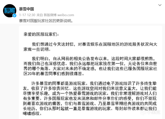 相反,暴雪中國在一週前發佈的《暴雪對國服玩家社區的更新說明》,就讓部分國服玩家感到不爽。在這則公告中,提及的“網易相關公告發布以來”,以及“想網易把協議順延六個月”等內容,有點顛倒是非黑白的意味。暴雪的公告體現更多的是傲慢,先入爲主,而網易這封致玩家的信,更多體現了網易的大度,對玩家的真誠。目前距離暴雪遊戲國服停服僅剩幾個小時,國服玩家好好享受這段時光吧。如何看待網易的這封最新的致玩家的信?歡迎在評論區討論。