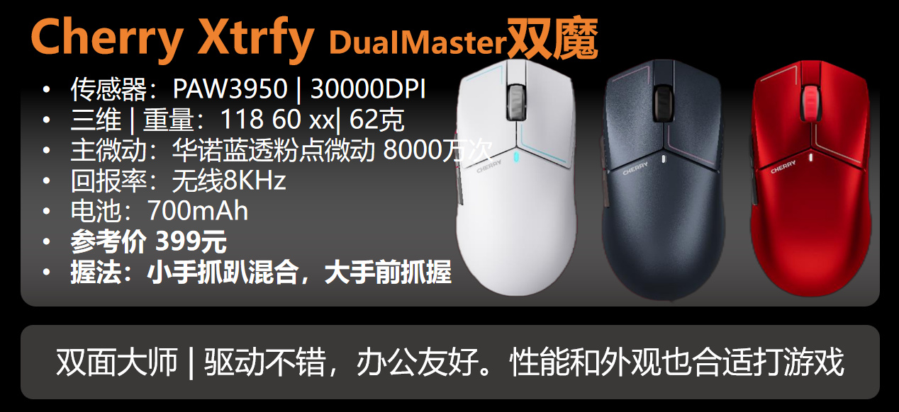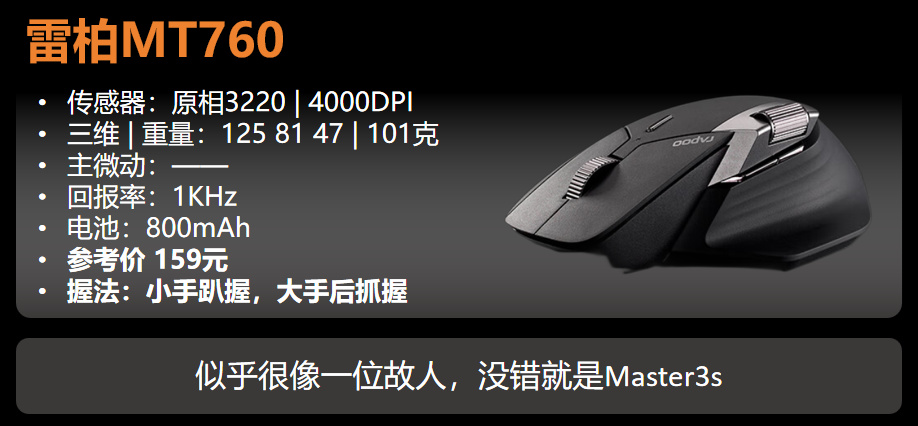回到Master3s,如果你确实觉得自己的手心没啥支撑,又是办公环境,确实可以直接入Master3s。如果你不确定自己是否合适,咱建议考虑前面的雷柏MT760先试试。如果你发现MT760不能满足你了,这时候再换Master3s也不是不行。