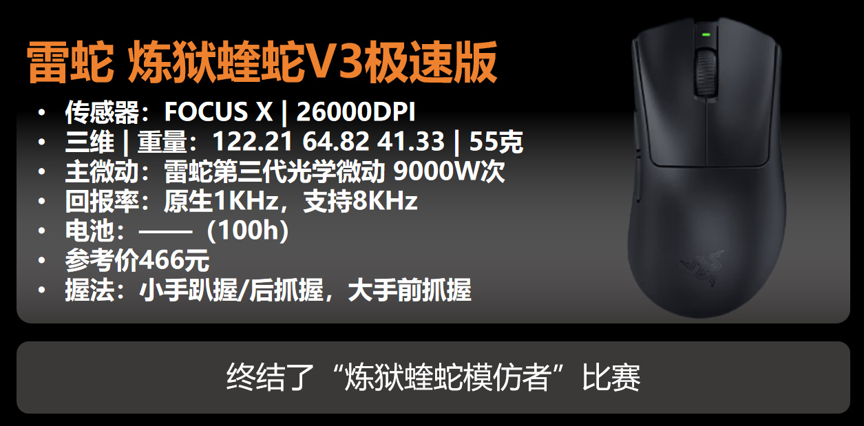 东西是好东西,在炼狱蝰蛇基础上做了缩小,对于之前用专业版不舒服和不习惯的佬爷们,在极速版做了非等比例缩小,手感舒服了不少,甚至直接终结了“炼狱蝰蛇模仿者”比赛。而且新加入的动态DPI效果确实很棒。