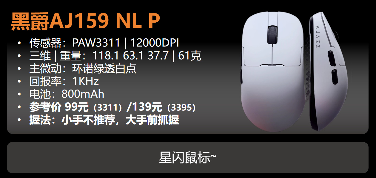 如果你之前是AJ159的用户或者想试试星闪鼠标,还是挺推荐的,100不到的价格要什么自行车?!