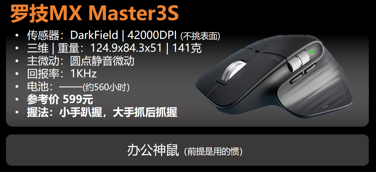 罗技的Master3s有不少公司职员在用,大手,不讲究操控,只讲究省力和舒服。(至于125Hz刷新率见仁见智吧)