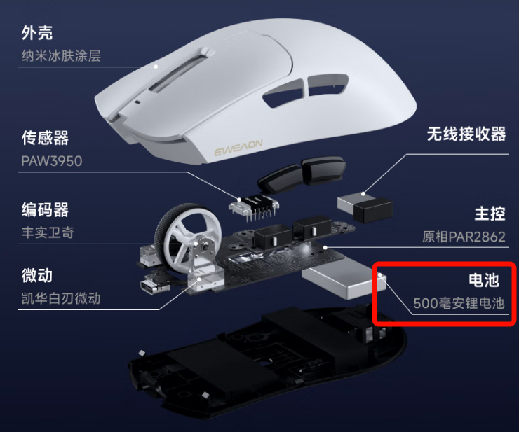 传感器用的是PAW3311 12000DPI,正常来说打到大师都够用了。电池400mAh用半个月没问题,但它这个主控功耗并没有做太多优化,估计也就用个10天左右