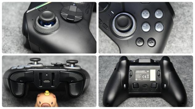 這是一款FPS手柄,針對於FPS遊戲做了許多設計,除了兩個背鍵外,還在頂部設立了兩個自定義按鍵,不必使用C手,也可以順暢的控制多個按鍵,碳膜搖桿在FPS遊戲中有着更線性的表現,並且爲ALPS碳膜搖桿,0死區,2000搖桿分辨率放在現在也十分夠看,無線回報率雖然只有200hz但也夠用,實在不行可以切換爲有線的1000hz,按鍵可映射鍵盤,此外還有耳機接口、扳機鎖和不同高度的可替換搖桿(套餐版)。除了FPS遊戲外,其他方面表現也很優秀,好看的燈環特效,磨砂的手感,包膠的握把,底部還有清晰多樣的設置按鍵。