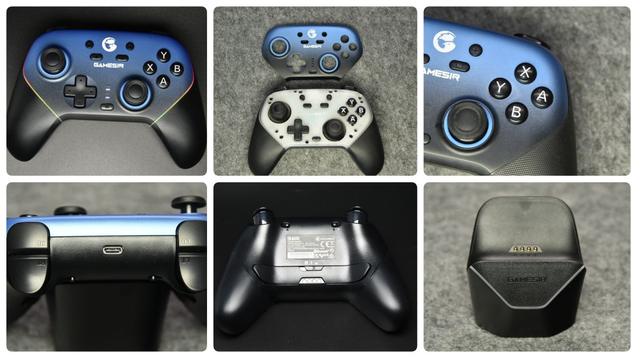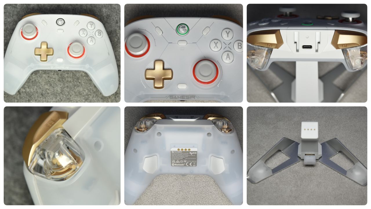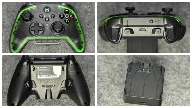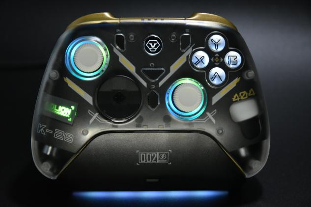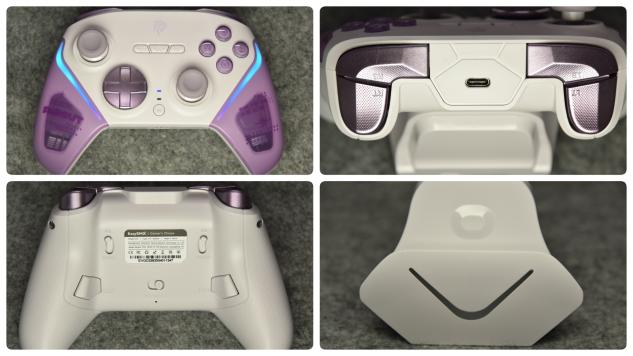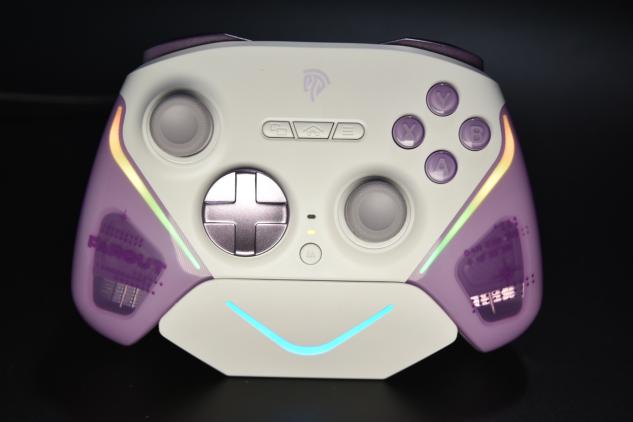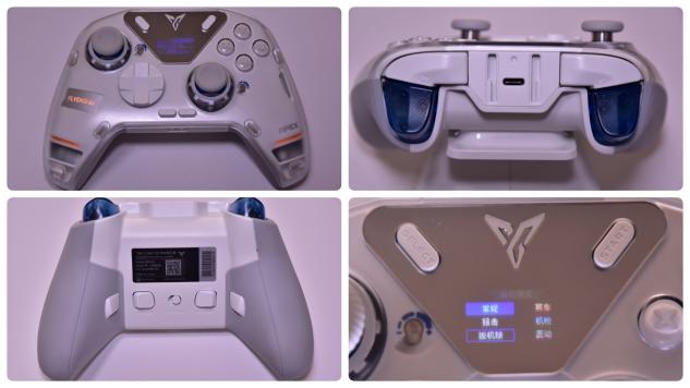 不得不說澳加獅在顏值這塊是有一手的,霧透的外殼加上內部好看的圖繪和燈光,讓這款手柄在此價位有着獨一份的顏值。但如果僅認爲這是一款顏值手柄,那就錯了,這款手柄面殼、搖桿、十字鍵、背鍵皆可拆卸,還附贈有充電底座、替換搖桿和十字鍵,甚至怕按鍵不夠,在底部還額外安排了兩個按鍵,手感上也表現優秀,尤其是其肩鍵,達到了第一梯隊的水平,背鍵這種方案算是目前最優秀的了,十字鍵雖然是導電膠按鍵,觸發速度和手感無法與機械按鍵相比,但八向的十字鍵旋轉手感還行,拿來玩格鬥遊戲也是尚可的。