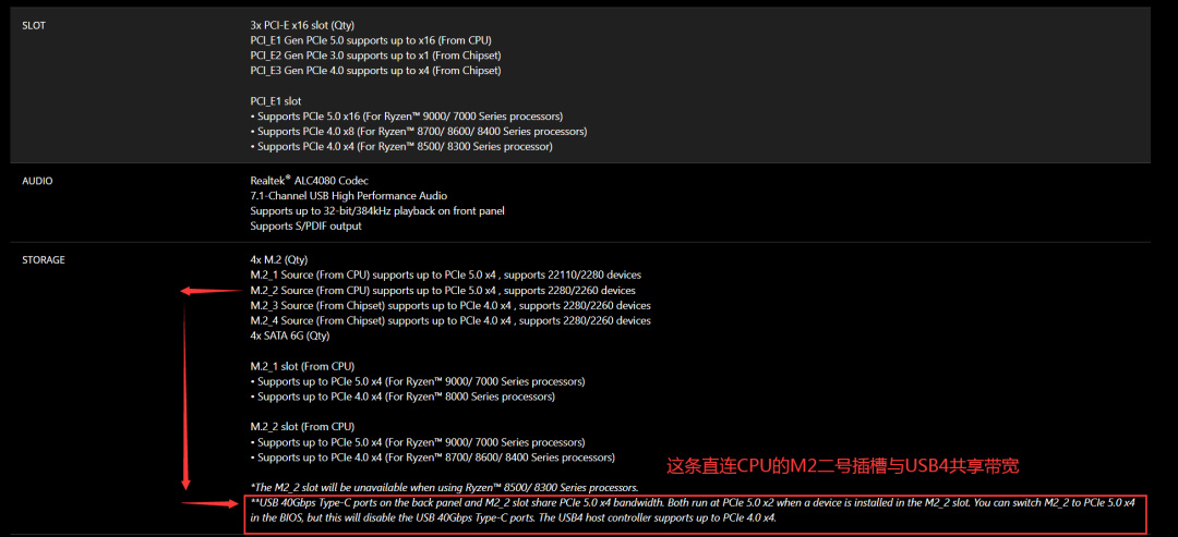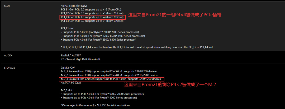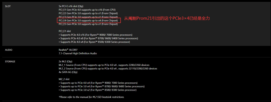 那再來說說雙芯Prom21的X670/E和X870E,由於二仙橋設計,第一顆Prom21要同時負責CPU通信和對第二顆Prom21通信,因此它只有一組PCIe4×4和一組PCIe3×4供板廠發揮,這一部分一般會做成一個M.2和四個SATA。