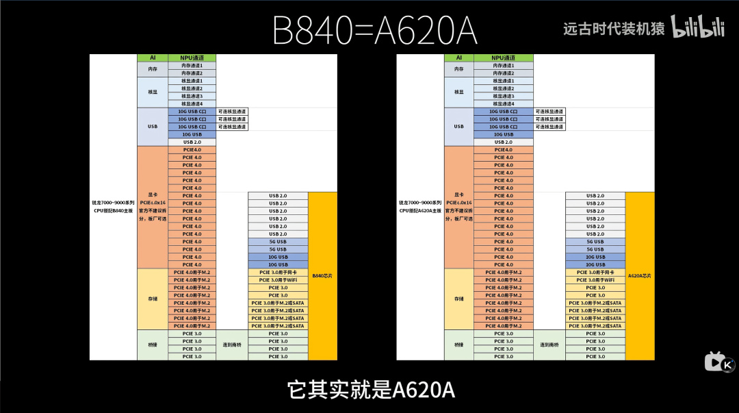 真正的神人在於B840,這個芯片組的前身是A620A,絕大多數朋友都沒有聽說過,因爲這是基於A620,把Prom21和CPU橋接通道縮減成了PCIe3×4速度,從而進一步下調了AM5平臺門檻。而B840作爲AM5中最神的一款,它直接從A620A改名,沒有任何變化,直接莫名其妙冠以“B”開頭的名字,如果你沒有閱讀這篇文章,你會不會以爲B840是B650的換皮?所以千萬避雷B840主板,除非它降價到500塊。