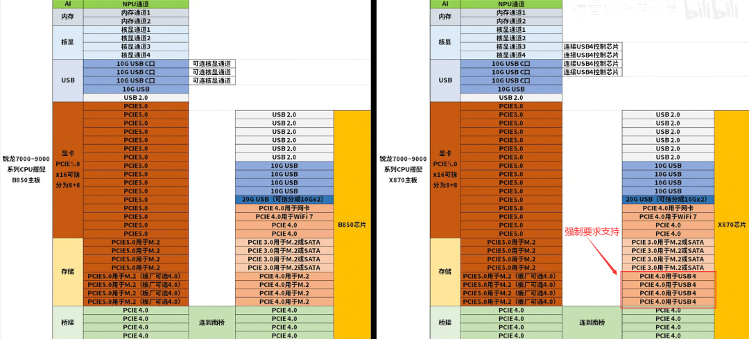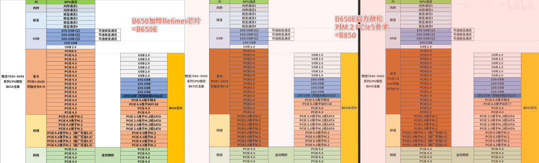 隨9000系列推出的B850芯片組則是B650E的簡配版,因爲Retimer芯片有×8、×4區別,因此板廠可以選擇對其中用於存儲的8條PCIe4通道,只增強其中4條,達到PCIe5×4和PCIe4×4的配置,這是相當於B650E時代一部分板廠削減成本的方案拿到了檯面上被承認了的情況。