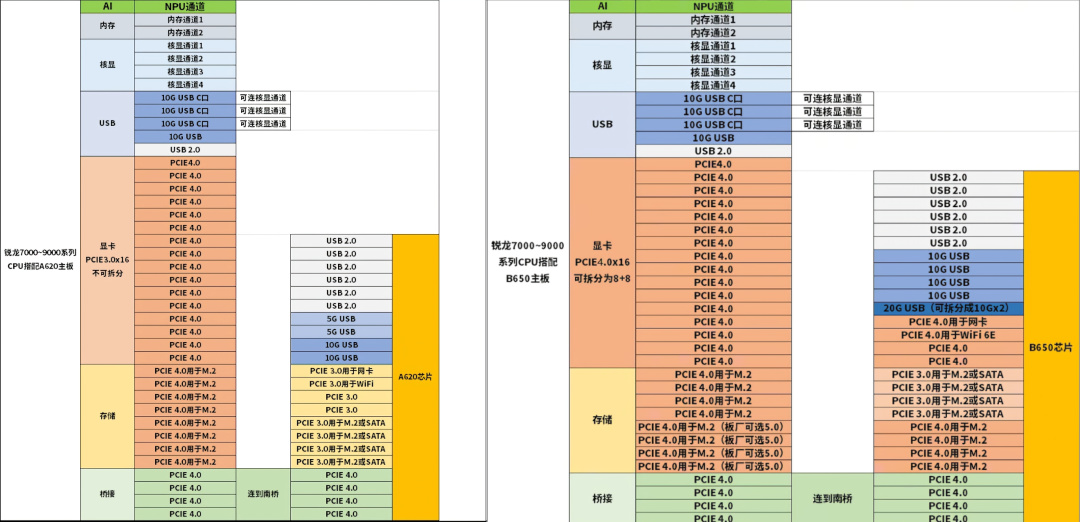 但是AM5主板還有高手,那就是傳奇A620、A620A和B840。先說A620,這個其實沒啥毛病,當時推出就是因爲B650相對較貴,所以推出這個來拉低了AM5平臺的門檻。至於閹割了哪裏,那就是把Prom21引出的PCIe通道降速爲了PCIe3,還有減少了部分USB接口,如圖:
