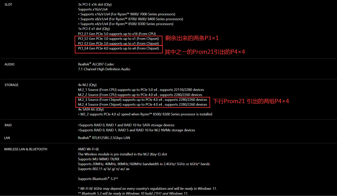 Prom21本身一共能提供三組PCIe4×4和一組PCIe3×4通道,但是其中一組P4×4需要與CPU橋接通信,無法連接PCIe設備所以略過;另外兩組P4×4板廠可選擇製作成M.2或者PCIe插槽,但在單芯片情況下大部分板廠選擇其中一組做成無線網卡和有線網卡的通道,並且剩餘兩條PCIe4通道,可能被空閒也可能被做成額外的M.2插槽;最後P3×4則被做成了4個SATA接口,當然板廠也可以做成PCIe3×4的M.2設備插槽。