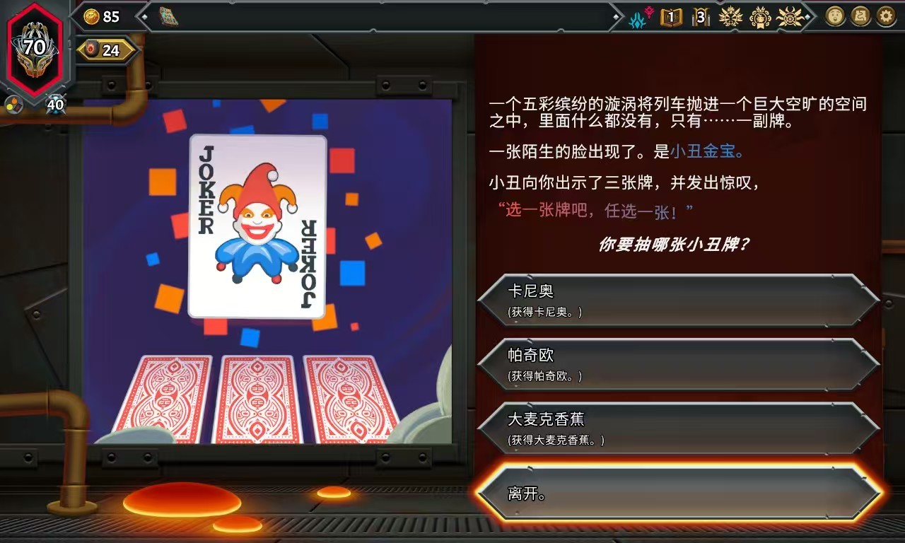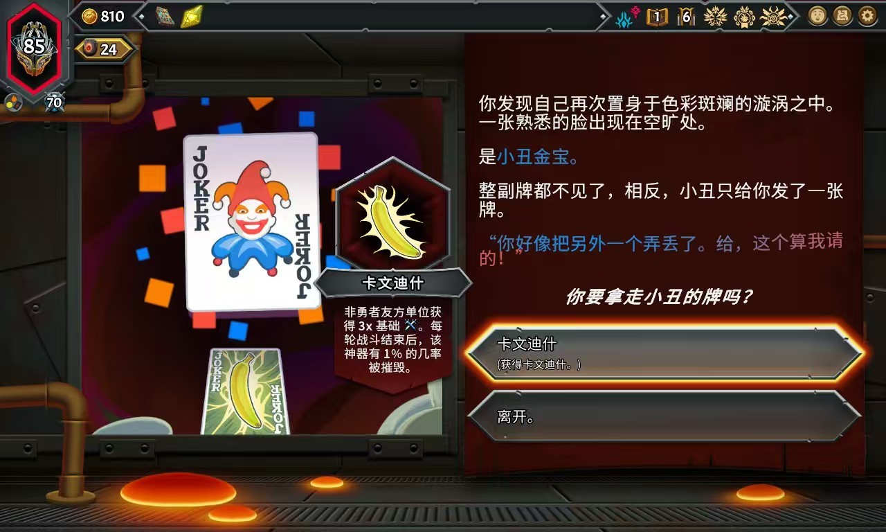 另外就是联动事件,比如说小丑牌,大伙能看到非常熟悉的几个遗物,这里我选择的就是大香蕉了,强度很高,前期过渡很好用,避免了第一层打不死后续伤害不足的情况,而且丢失也会送你一个卡文迪什,丢失之后的下一次事件房的时候。