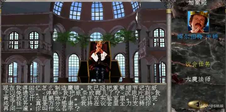 随后在冒险过程中——或者说寻找趁着你睡觉独自溜走的王子途中,你来到了铁拳城堡附近山上一位隐士家中。他提到你应当寻求自由天堂的“神使”帮助,但首先要获得包括摄政王在内各自管理着恩洛斯几个地区的六位高官的支持,比如浓雾镇首席大法师,患有健忘症的牛顿公爵;或是管理着银湾镇的财务女大臣,恩洛斯首席德鲁伊弗丽斯夫人。